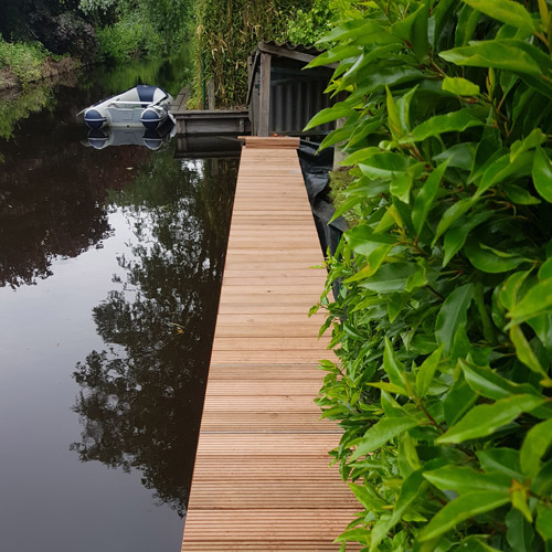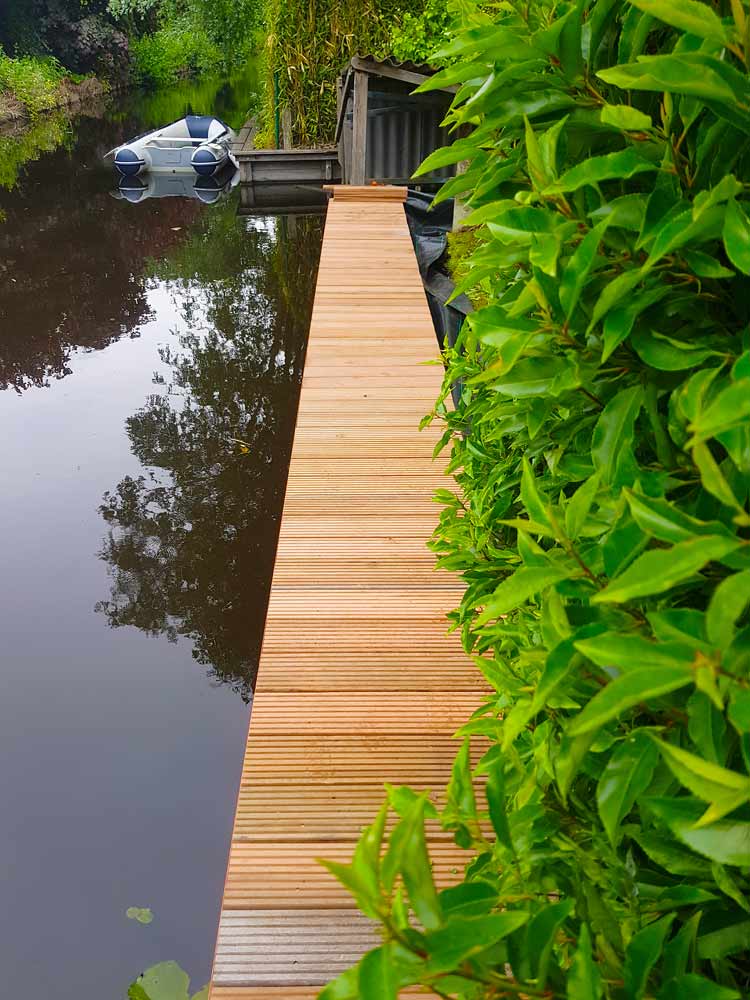 We kunnen houtenvlonders in verschillende vormen/afmetingen voor u maken. Vlonders kunnen zowel aan uw huis gemaakt worden als verlengde van uw woonkamer, midden in de tuin als gezellig zitje of leuke onderbreking. Maar we kennen de houten vlonders vooral aan het water. Om lekker aan te zitten en te vissen. Of bent u de gelukkige eigenaar van een boot dan kunnen wij van een vlonder ook een mooie aanlegsteiger maken.